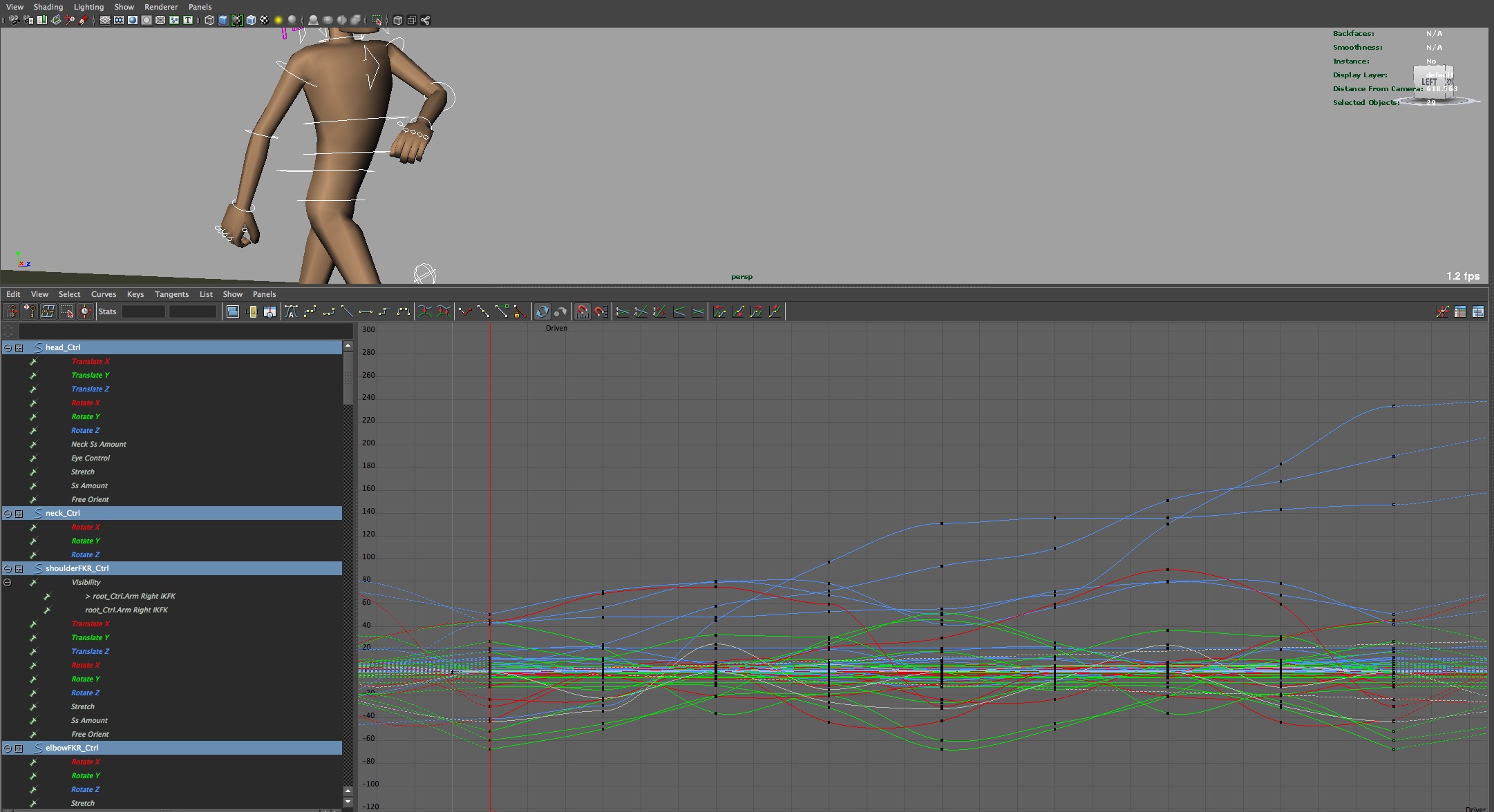 Starting out in class we looked at different types of rigs for the ball and characters and explored ways they can be brought to life. We covered setting up poses, the bouncing ball, a walk cycle and finishing the semester with an introduction to basic animation physics. Looking at the key principles: timing, spacing, weight, squash and stretch. Needed to research and get my own reference then break down the reference.