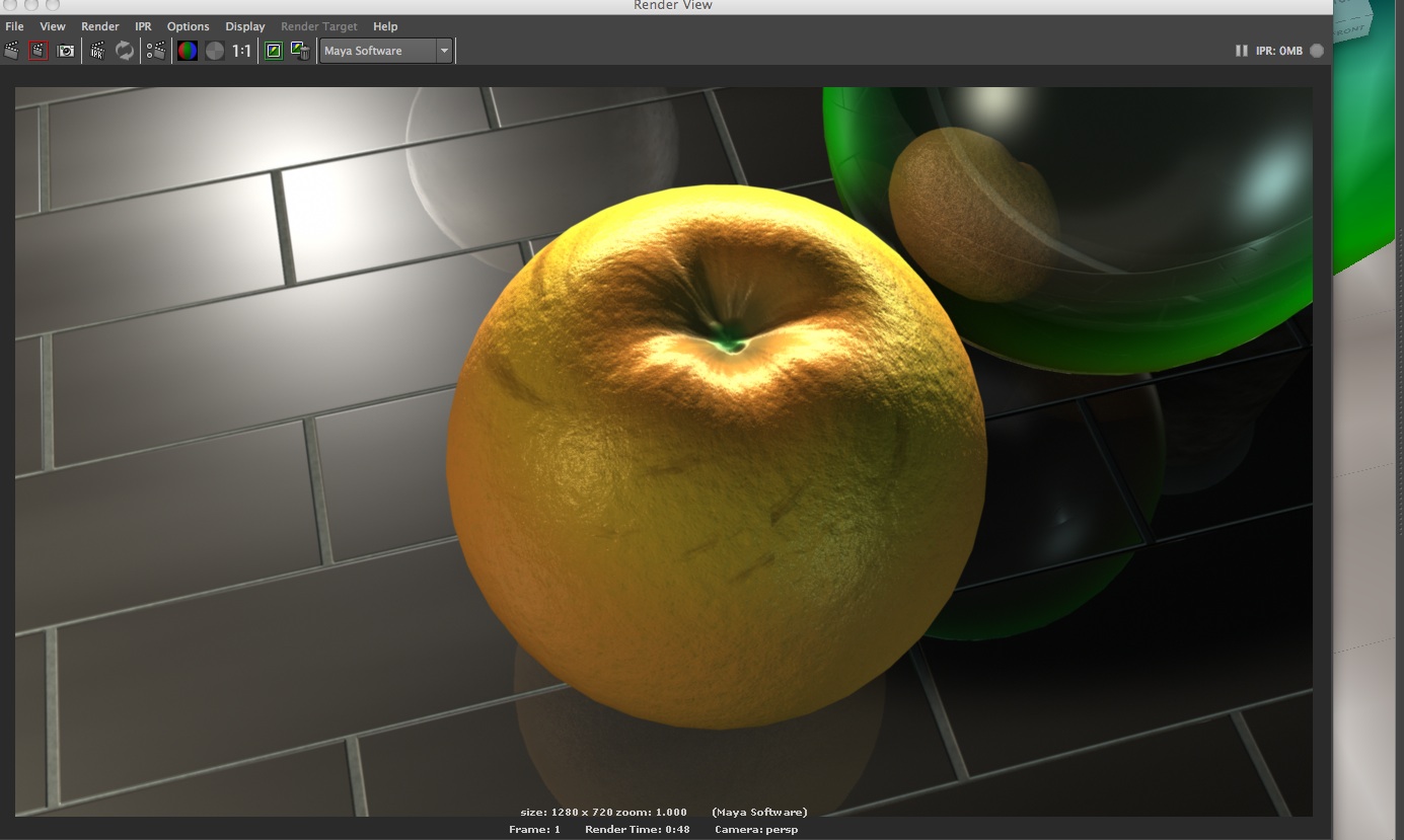 By using one or several of the layers created in mudbox to make these black and white images I’m able to adjust the attributes in the apple’s Mental Ray’s shader. Adjusting the values of the file in colour balance of the shading network translates into how the surface qualities for reflection’s reflectivity and glossiness appear in the final render of the surface.