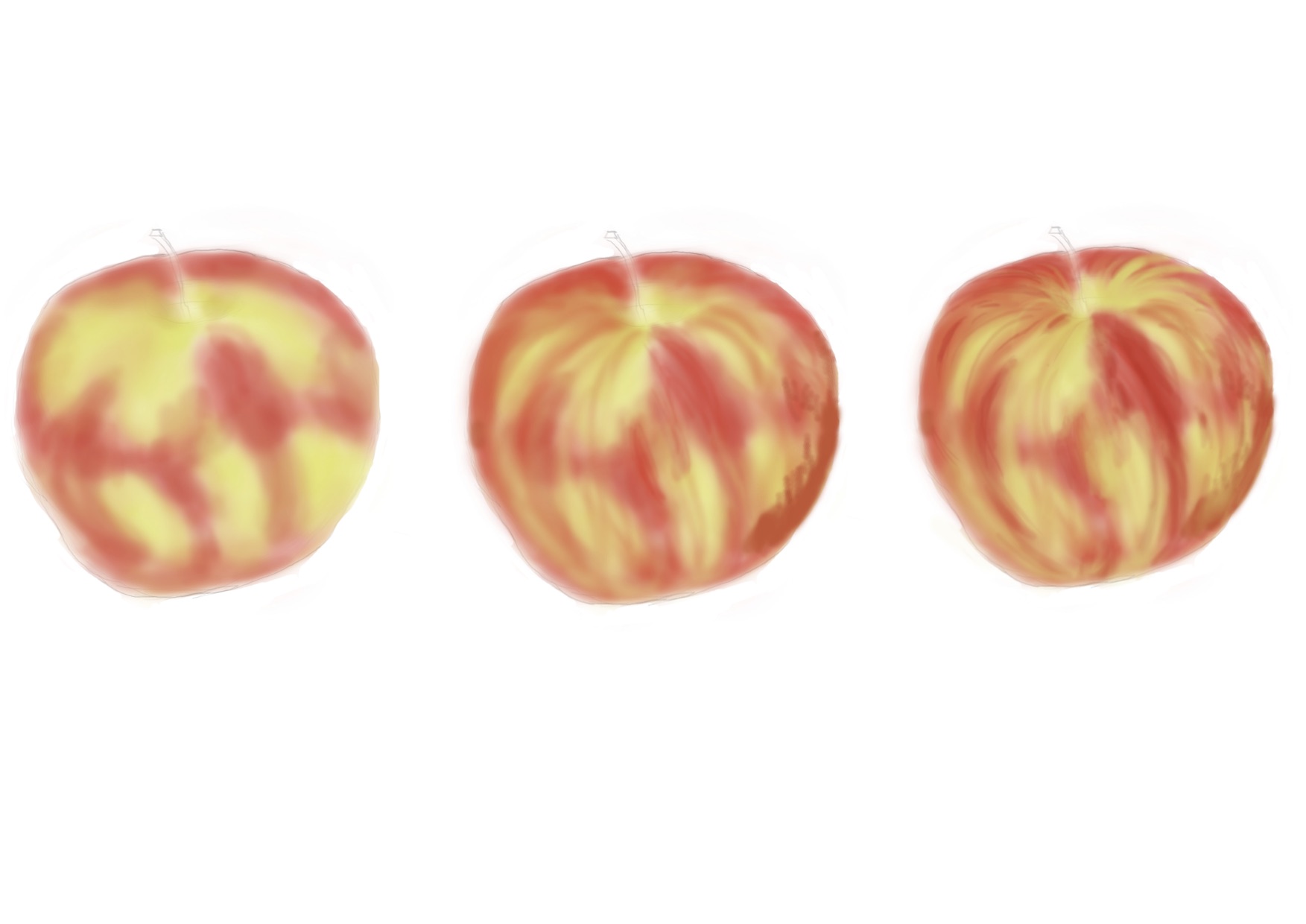 I starting with the sketch layer while thinking about the apple’s placement with reference to the objects point of view, the setting, any interesting points of reference and the lighting. Applying the layered working structure we covered over the last few weeks there are the sketch, under paint, mid-pass, refine, detail, highlight and shadow layers to create the apple and surface texture. For the underpainting we chose two or three colours from the colours on the apple surface, the brushes do not matter much and slosh down the colour breaking up the surface with solid colour. The mid-pass breaks up the surface a bit more, bridging colours and starts to work the contour of the surface, called cross contouring. Follow the direction of the form from the stalk to where it disappears at the bottom and using slightly lower opacity and soft edges on the brush to continue building up the apple’s texture. The colour is also stronger in the middle with softer edges, blend by picking soft colours with bridging colours, a couple of variations of yellow and red with some apple green mixed in. Moving to a smaller brush, modifying it by adjusting bristles, thickness, softness and stiffness to start building more detail.