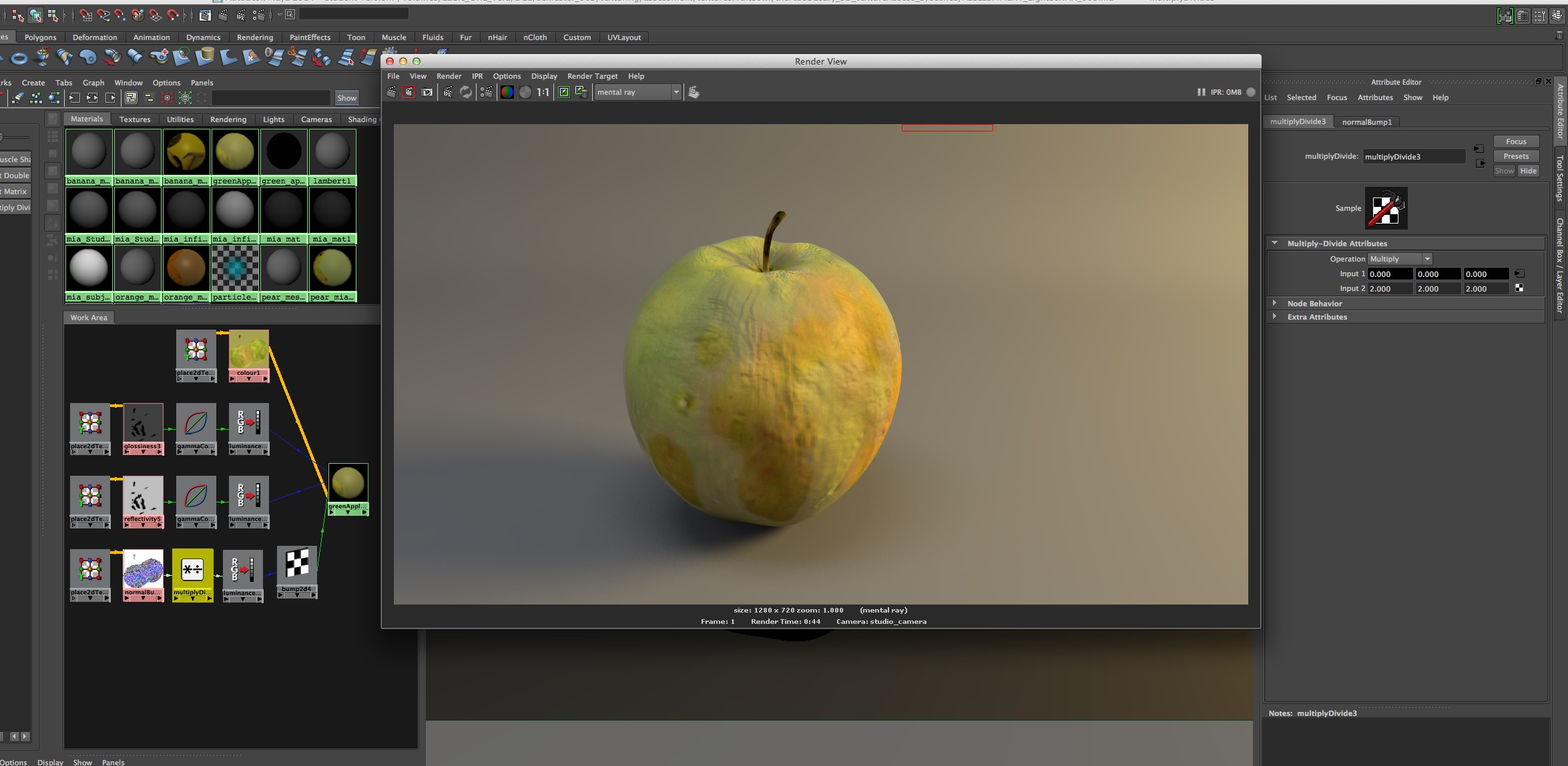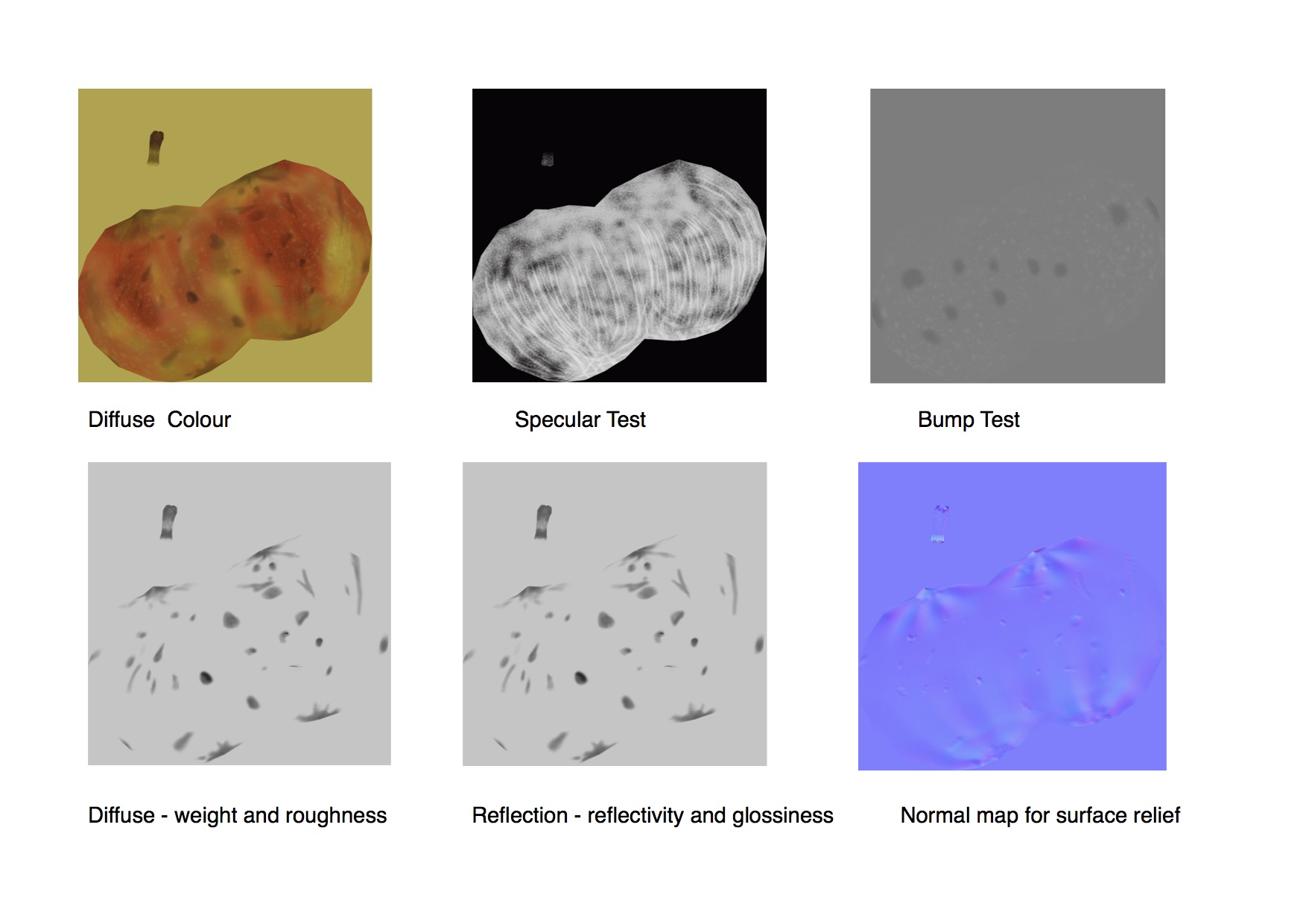 To show these surface relief changes for the apple I sculpted the surface creating a normal map, the bluish coloured one above, to assign to the Maya shaders bump attribute to create the illusion for the changes in surface shapes. I was not doing all the sculpting on the appropieate subdivisional levels, creating differences in the sculpting of the surface is specific to that layers number of polygons, I was sculpting on the base layer as well. Mudbox needs the difference in the surface shape to create the normal map and this reduced the amount of surface changes created by the normal map and changed how the surface looked in my render. It was possible to adjust the normal map in photoshop by duplicating and adjusting the layers using overlay.