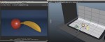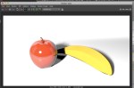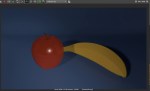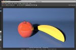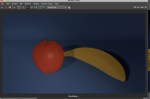 Now looking at texturing with photoshop. The UV Texture editor in Maya makes it possible to used two-dimentional images on three-dimentional objects, known as texture mapping. The projections of the banana shape’s 3d surface was already there then in the uv texture map I was able bring these separate surfaces together, making a flat surface for painting in photoshop. This painted file is them saved in the projects files and with a file node is mapped onto the banana giving the painted look. In the shot below the apple still has the procedural texture and the banana has the painted photoshop surface.