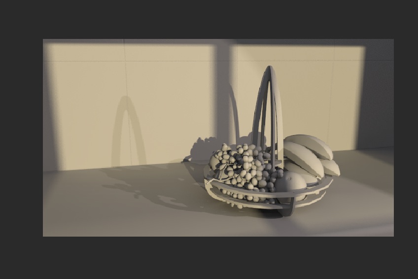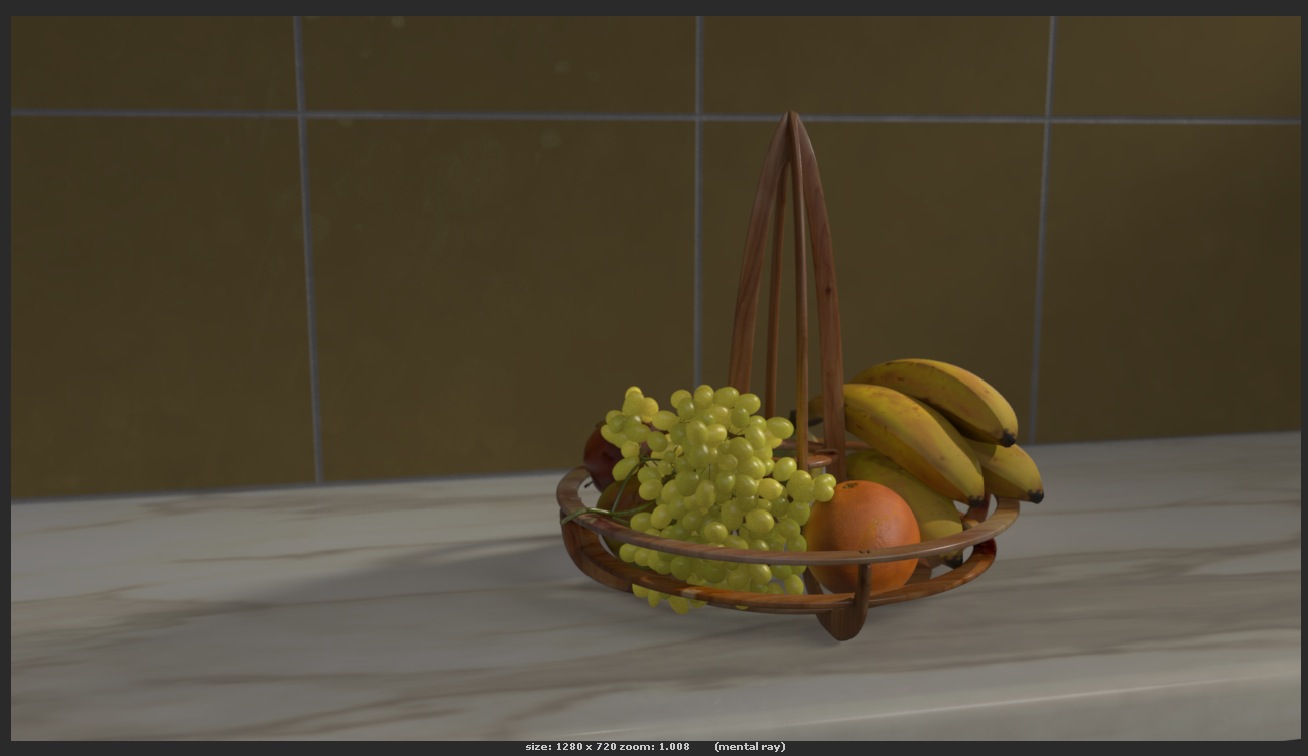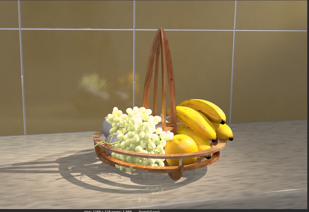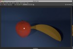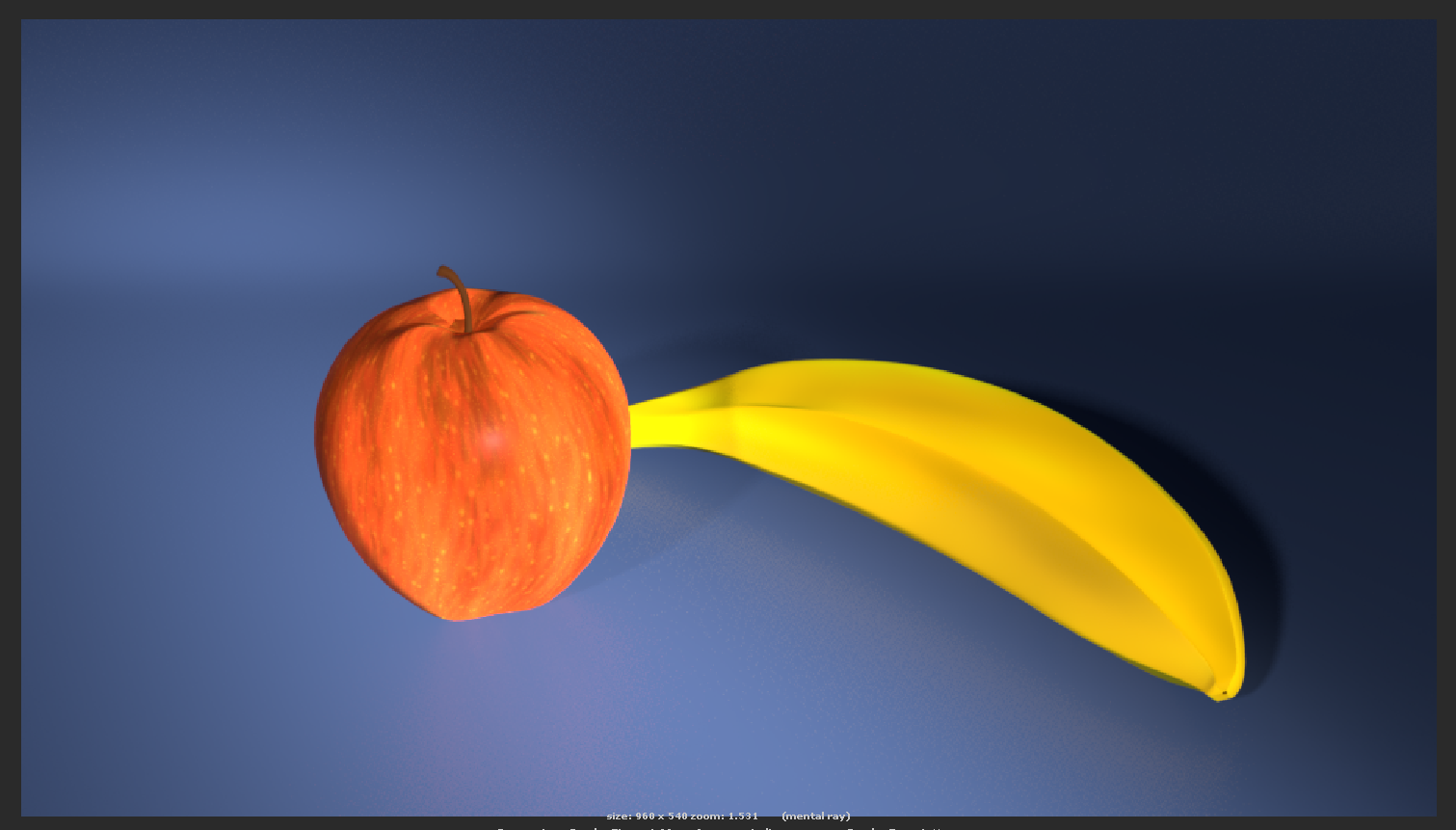 Using the mia_material shader assigned to the apple, it’s stem and the banana This is a monolithic shader, meaning it has the ability to represent many surface types and aspects of something, supporting most materials with its many attributes. I am able to adjust the diffuse and reflective qualities of the objects. The surfaces are too reflective, shiny with the banana being more diffuse and not having the reflective hot spot and the stem not as reflective either.