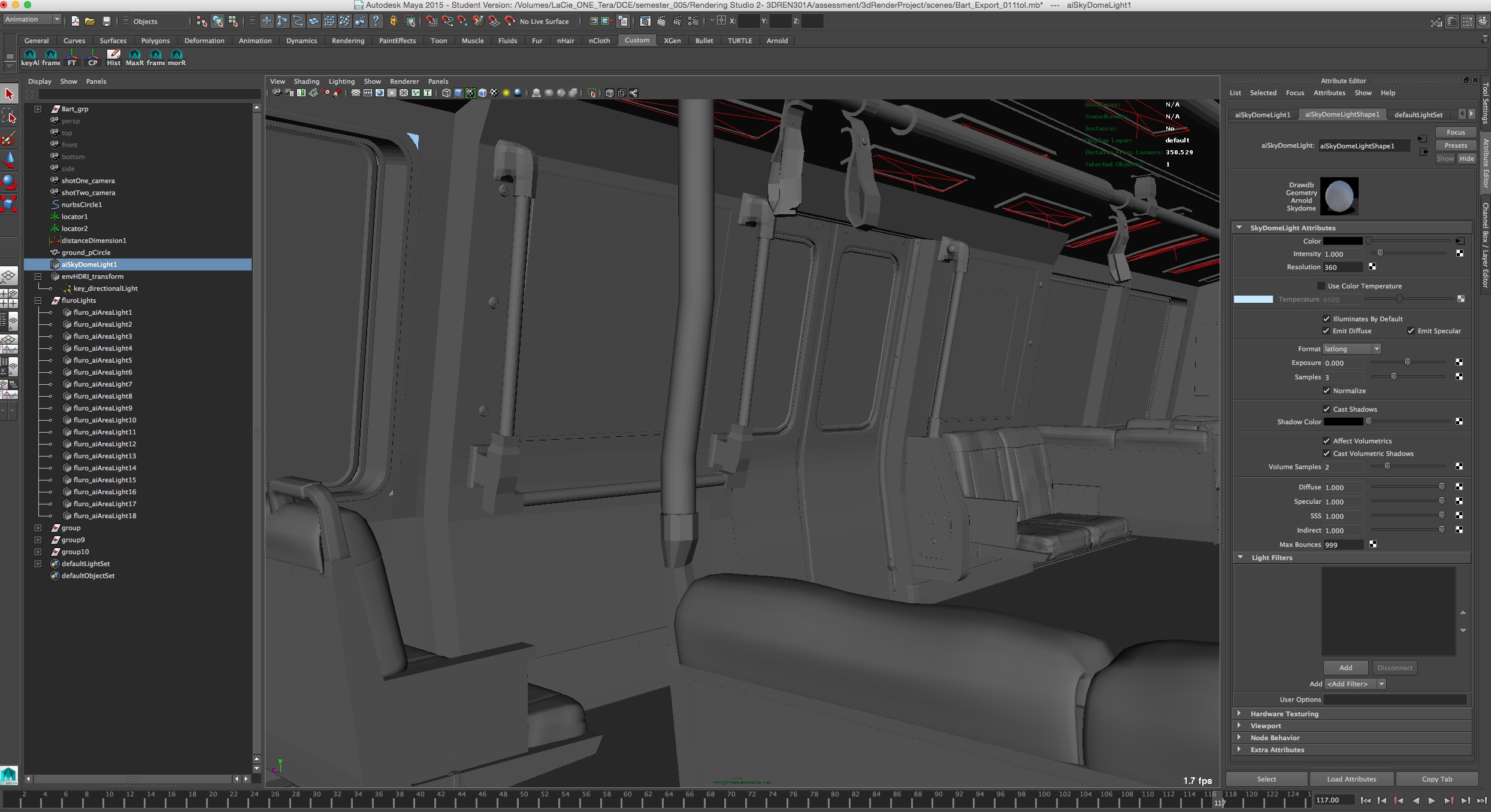 The interior light’s shadows are not creating the realistic light and depth of shadows to reflect the environment, the seat’s shadows on the floor, window frames and joins between the ceiling, walls and floor to give the feeling of space and depth. Moving the aiArea lights to where the overhead lights have been made in the geometry the light is combining better from the different areas of the ceiling and Arnold starts to do a great job of creating the realistic indirect light and shadows.