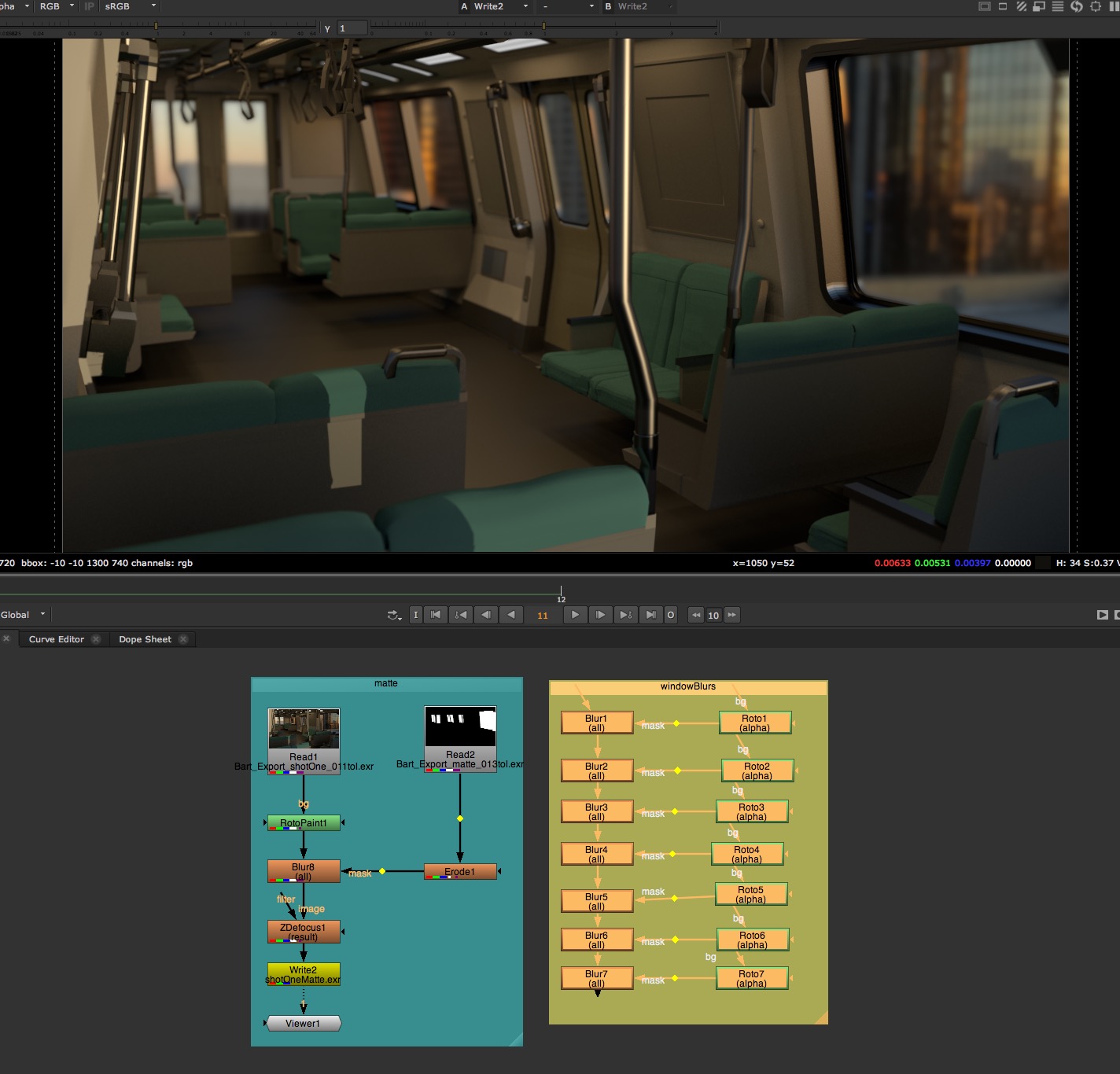 I wanted to blur the windows, meaning the image that can be seen through the windows would be blurred. To save on render time this was done in Nuke using a blur node and roto shapes for the windows. This gave me more control on each window, ability to vary the blur for each window and no needed to wait for renders to see how the values were blurring. It was almost instant to see how it was working when using Nuke.