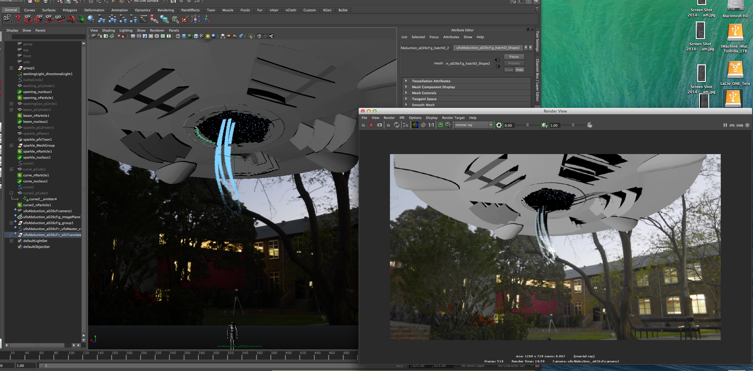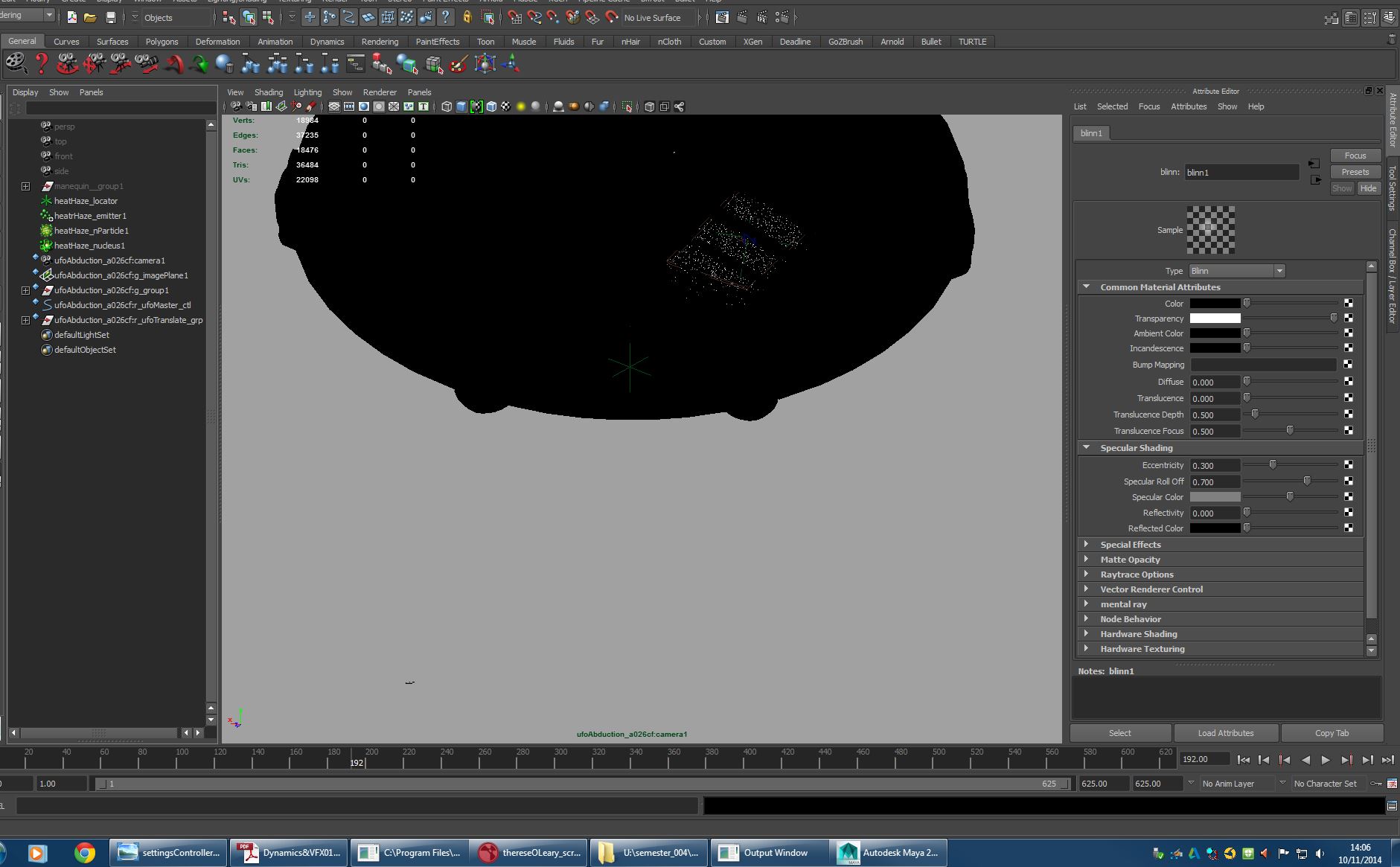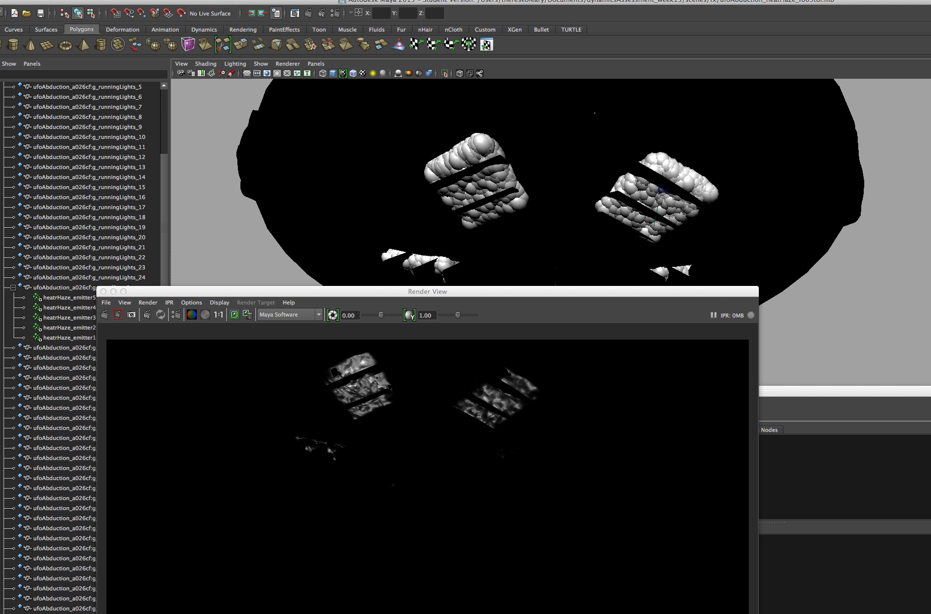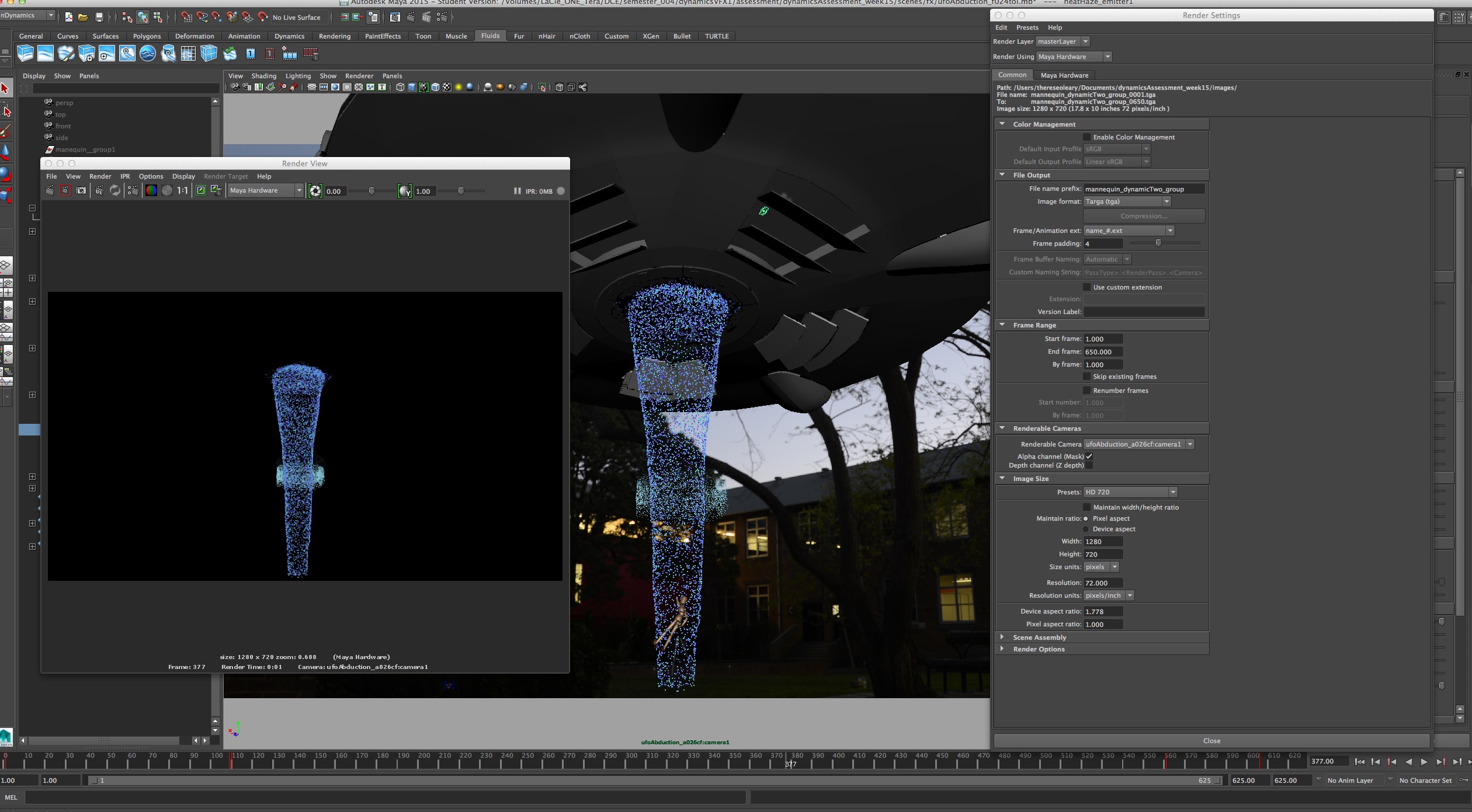 This is where I explored the used of different fields, their attributes and animating the values. I used a combination of air, turbulence and gravity to create different shapes with the particles moving from the chair. I animated the magnitude on the fields, adjusted the attenuation, the directions and animated the magnitude values. I decided to delete the gravity field and changed the airField to wind. There still needs to be more randomness in the look of the particles breaking up and could look more like they are being blown away by a fan or in a breeze.
