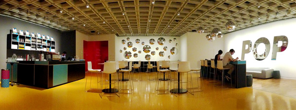 The Pop Cafe, offering special food and drinks was a different inclusion in the exhibition. On the wall as you enter the Pop silver sign reflects on the silver spheres suspended from the ceiling.