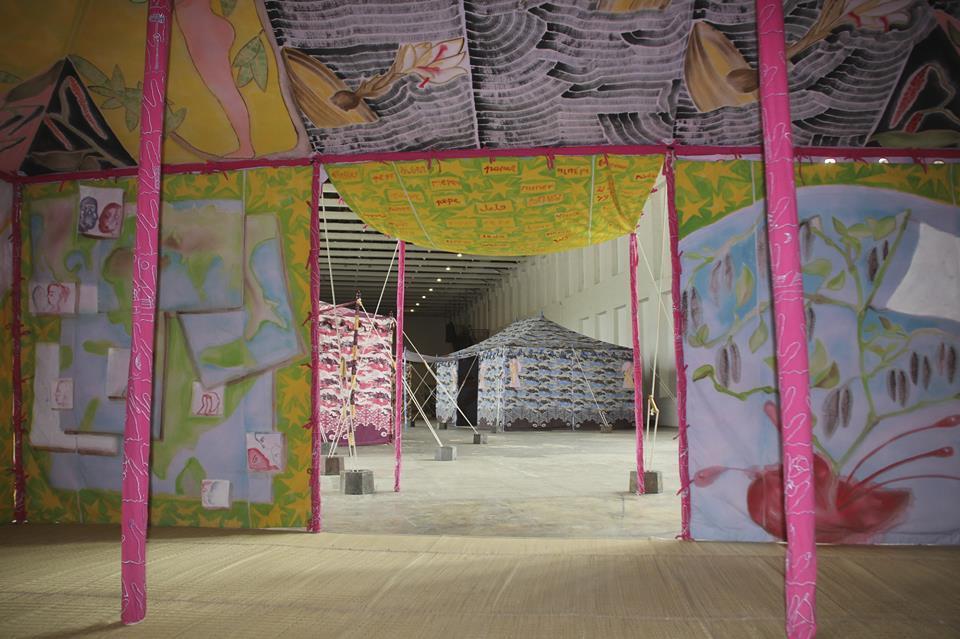 Created in collaboration with a community of artists in Rajasthan, India, with exteriors that combine camouflaged fabric and golden embroidery, the tents in Encampment invite us into jewel-toned spaces populated by Byzantine angels.