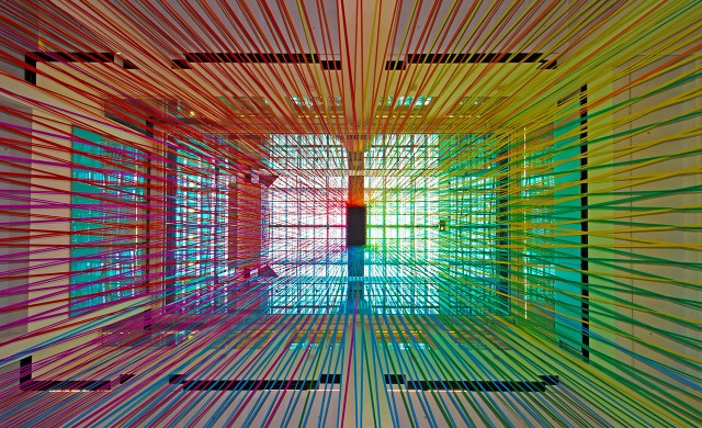 A grid of 100 flip-clocks, the numbered cards have been replaced with sheets of brightly coloured paper set to a 24-hour cycle. The cards gently click over on the minute or the hour.