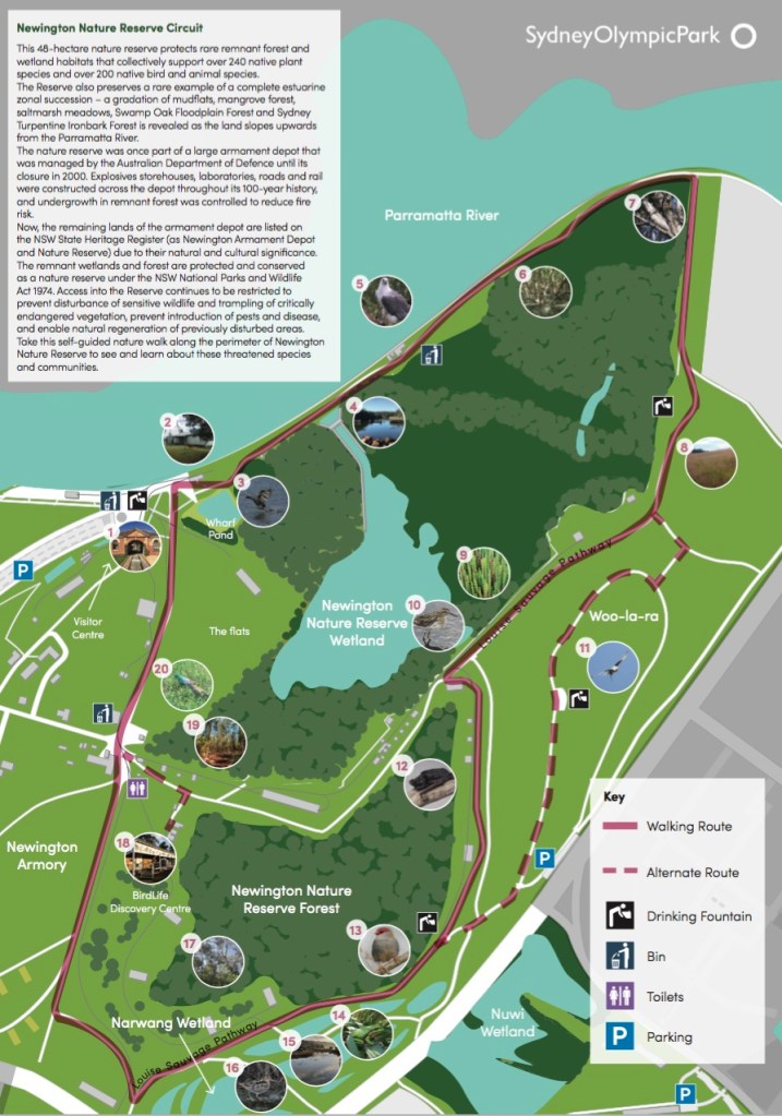 Act 1974. Access into the Reserve continues to be restricted to prevent disturbance of sensitive wildlife and trampling of critically endangered vegetation, prevent introduction of pests and disease, and enable natural regeneration of previously disturbed areas. Take this self-guided nature walk along the perimeter of Newington Nature Reserve to see and learn about these threatened species and communities.